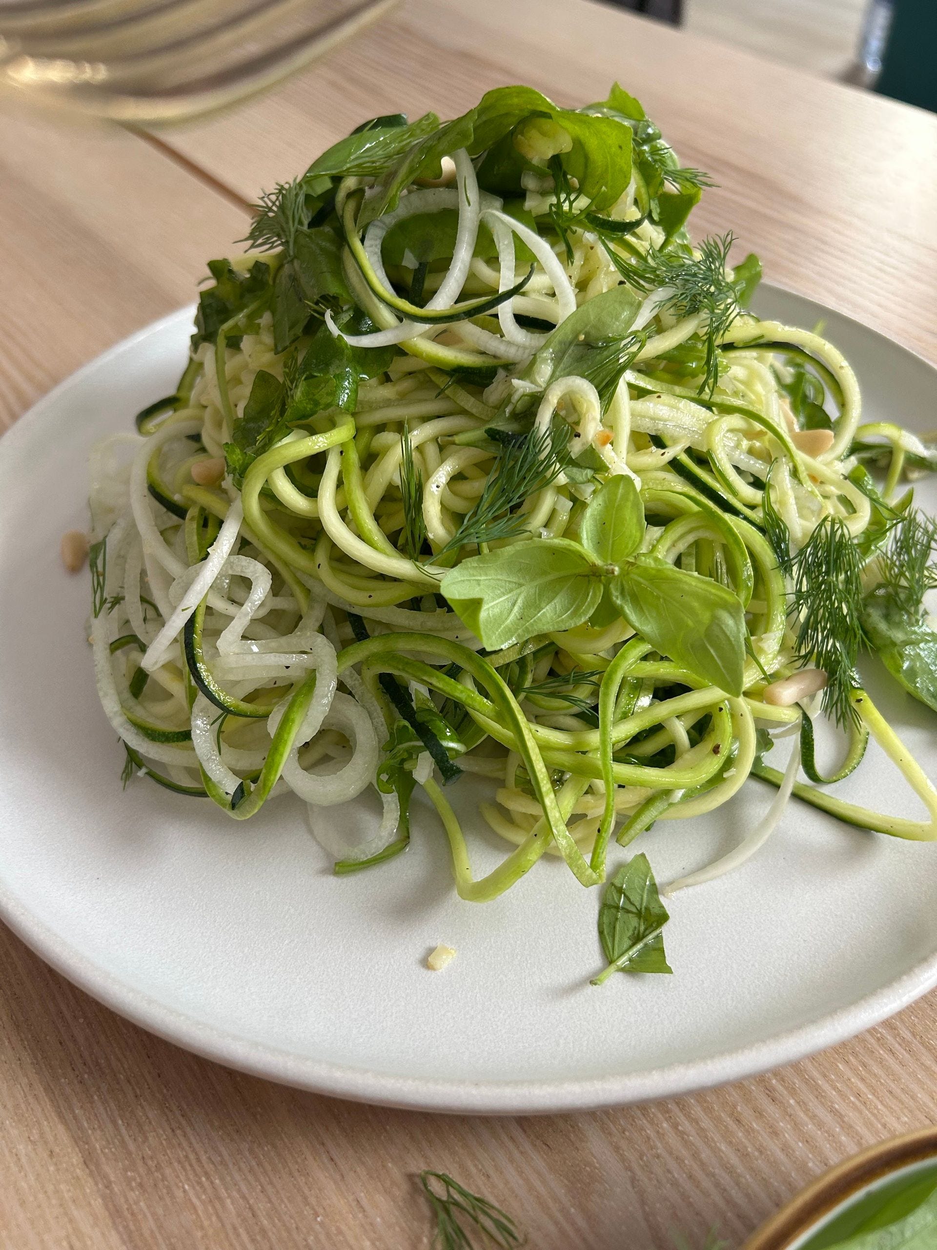Think light zucchini noodles with summer daikon & fresh herbs - bright, healthy, and done in 5–10 minutes.